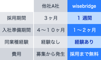 初期費用および月額費用は一切不要。採用が決定するまで、完全無料でご利用いただけます。 急な人材補充や事業拡大に伴う大量採用が必要な際も、ご希望の条件をお知らせいただくだけで、当社より適任の人材をご提案いたします。